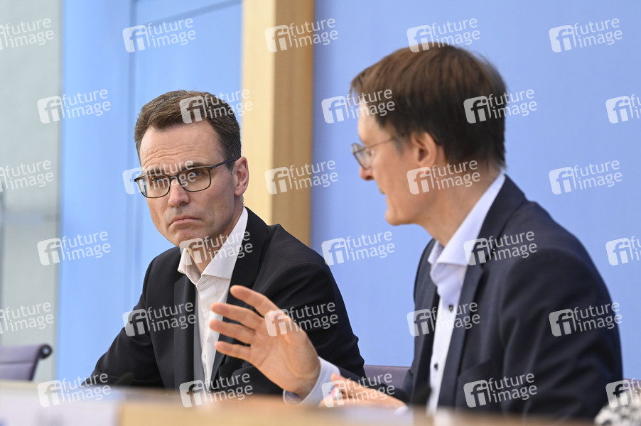 Stephan Baldus und Karl Lauterbach bei der Bundespressekonferenz Gesundes-Herz-Gesetz im Haus der Bundespressekonferenz. Berlin, 28.08.2024