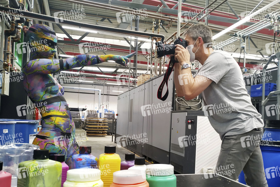 Model Lisa mit Projektfotograf Tschiponnique Skupin - Jörg Düsterwald, einer der bekanntesten Bodypainting- und Bodyartkünstler Deutschlands macht auf seine ganz eigene Art auf die prekäre Situation freischaffender Künstler während der Corona-Pandemie aufmerksam: Unter dem Hashtag #WirzeigenFarbe hat der Hamelner Künstler in der Produktionshalle der Druckerei QUBUS media mit seinem Model Lisa ein ausdruckstarkes Live-Bodypainting inszeniert - denn Künstlerinnen und Künstler wie er sehen und fühlen sich derzeit wortwörtlich 'ausgezogen bis aufs letzte Hemd'. Und nichts symbolisiert diesen bekannten Spruch besser als ein Bodypainting auf nackter Haut in einer Umgebung, in der es jeden Tag um Farbe geht. Die Live-Performance fand mit dem zeitgleichen Druckstart von Jörg Düsterwald's neuem Premiumkalender 'Bodypainting in Nature 2021' statt. Hannover, 14.07.2020