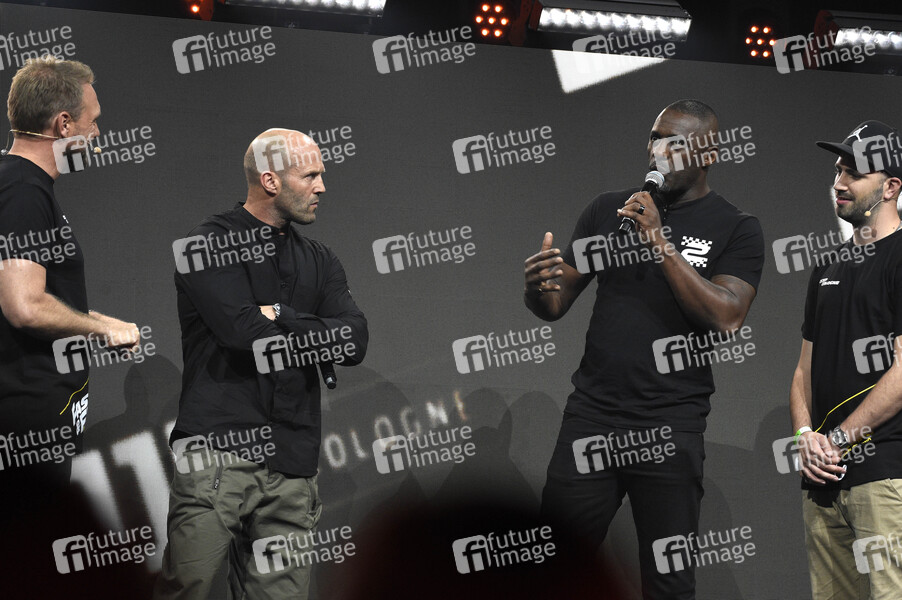 Steven Gätjen, Jason Statham, Idris Elba und Dominik Porschen bei der Weltpremiere des 3. Trailers zum Kinofilm 'Fast & Furious: Hobbs & Shaw' auf der CCXP Cologne 2019 auf dem Gelände der Koelnmesse. Köln, 28.06.2019