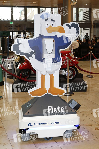 Fototermin mit Service-Roboter 'Fiete', einem mobilen Spender für Hand-Desinfektionsmittel der Firma Autonomous Units, in der Europa Passage, Hamburg, 28.11.2022