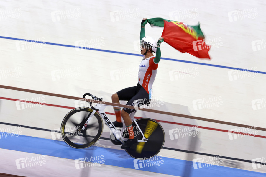 Sieger Iuri Leitao im Scratch 15km Männer bei den European Championships 2022 im Bahnradsport in der Messe München. München, 13.08.2022