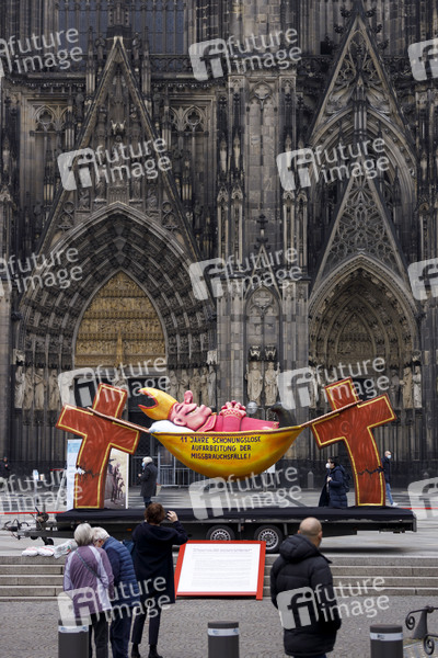 Eine Skulptur des Künstlers Jacques Tilly steht in der angemeldeten Demo 'Missbrauch in der Kirche' mit der Aufschrift '11 Jahre schonungslose Aufarbeitung der Missbrauchsfälle' vor dem Kölner Dom. Diverse Initiativen, die sich für Opfer von sexuellen Übergriffen durch Kirchenvertreter einsetzen, protestieren am Tag der Veröffentlichung des neuen Gutachtens zum Umgang mit sexuellem Missbrauch im Erzbistum Köln mit der Aufstellung gegen die schleppende Aufarbeitung von Missbrauchsfällen in der katholischen Kirche. Köln, 18.03.2021