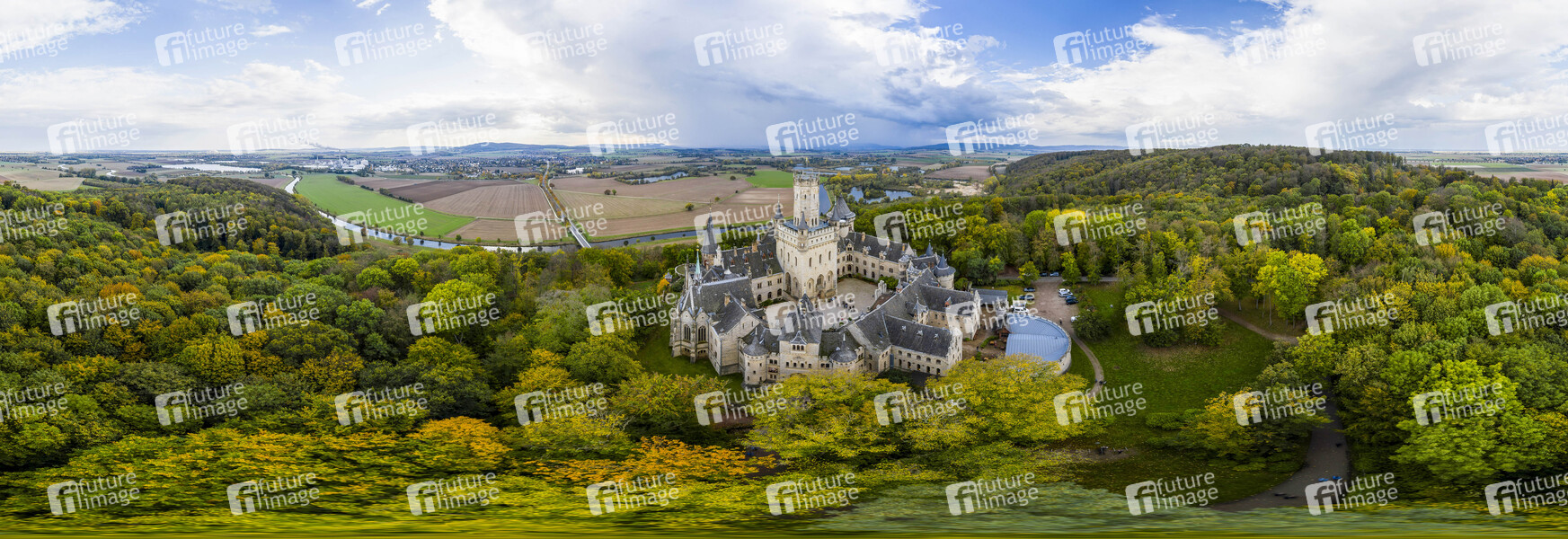 Luftbild vom Schloss Marienburg im Herbst auf dem Marienberg (Freigabe zur Veröffentlichung für Presse-und Öffentlichkeitsarbeit ist von Frau Annette Langhorst als Pressevertretung des Schloss Marienburg/EAC GmbH erteilt worden). Nordstemmen, 13.10.2019