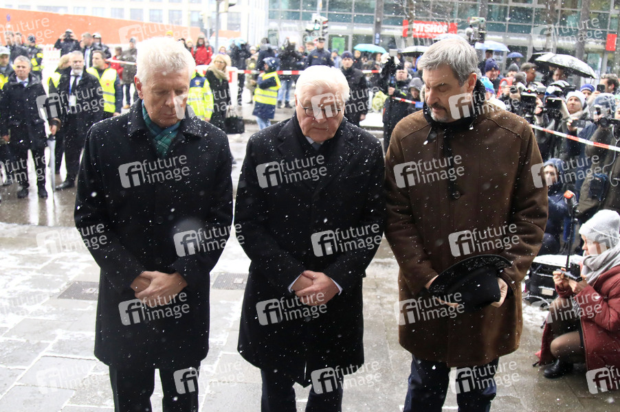 Dieter Reiter, Frank-Walter Steinmeier und Markus Söder beim stillen Gedenken am Ort des mutmaßlichen Anschlags vom 13. Februar. München, 14.02.2025