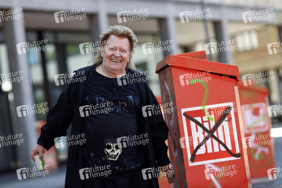 HA Schult bei der Präsentation seiner Installation 'Tableau des Vergessens' aus alten Bild-Verkaufskästen auf dem Börsenplatz. Köln, 10.09.2020