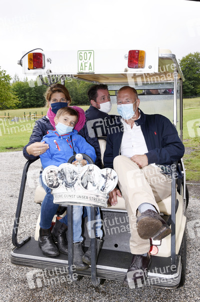 Martin Lacey jr. und Heino Ferch mit Ehefrau Marie-Jeanette und Sohn Gustav Theo Cian beim Presserundgang auf der Circus Krone-Farm. Weßling, 29.06.2020