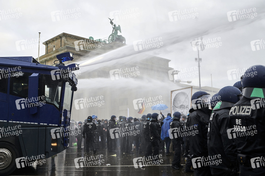 Tausende Demonstranten protestieren am Brandenburger Tor und im Regierungsviertel gegen die Corona-Politik der Regierung anlässlich der Bundestagsitzung zum Infektionsschutzgesetz. Die Polizei löst den Protest auf. Dabei kommt es zu Festnahmen, dem Einsatz von Wasserwerfern und Verstößen gegen die Maskenpflicht. Proteste in unmittelbarer Nähe des Bundestags waren zuvor untersagt worden. Berlin, 18.11.2020