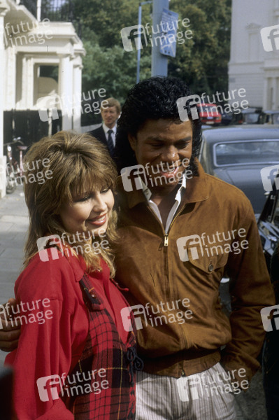 Pia Zadora und Jermaine Jackson beim Photocall vor einem Hotel. London, 10.09.1984