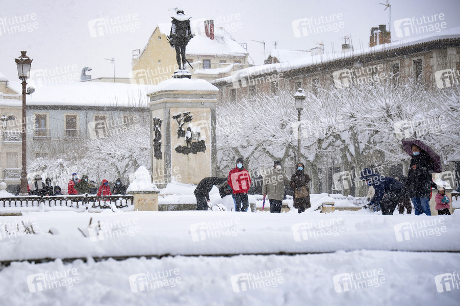 Plaza de Cervantes - Das Sturmtief Filomena sorgt in der Region Madrid und anderen Teilen Spaniens mit starken Schneefällen für Chaos. Die Hauptstadt Madrid wurde durch historisch heftigen Schneefall lahmgelegt. Seit 50 Jahren hat es nicht so geschneit. Der Verkehr ist in weiten Teilen des Landes zusammengebrochen. Alcalá de Henares, 09.01.2021