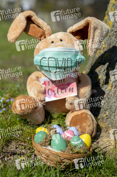 Easter Bunny, Frohe Ostern, Hase, Osterhase, Stofftier, Oster-Geschenke, Ostern, Osternest, Ostersaison, Osterzeit, Ostereier, Feiertag, Ostersonntag, Ostermontag, Atemschutz, Atemschutzmaske, Virenschutz, Schutzmaske, Schutzmasken, Atemschutzmasken, Maske, Masken, FFP1, FFP2, FFP3, FFP-Schutzklassen, Schutzklasse, Mundschutz, Mund-Schutz, Mundschutzpflicht, Mundschutz-Pflicht, Mund-Nase-Schutz, Mund-Nasen-Schutz, MNS, Ausbreitung, Maskenzwang, Maskenpflicht, Infektionsgefahr der Öffentlichkeit, Lock Down, Lockdown, Öffentlichkeit, Eindämmung, Seucheneindämmung, anstecken, infizieren, Vorbeugung, Prävention, schützen, Einschränkung, Verzicht, Seuchenschutz, Corona-Schutz, Virus, Viren, Corona, Sars-CoV-2, Covid-19, Coronavirus, Coronaviren, Corona-Virus, Corona-Viren, Ansteckung, Ansteckungsgefahr, Epidemie, Pandemie, Infektion, Infektionen, Corona-Maßnahmen, Symbolfoto, Symbolbild