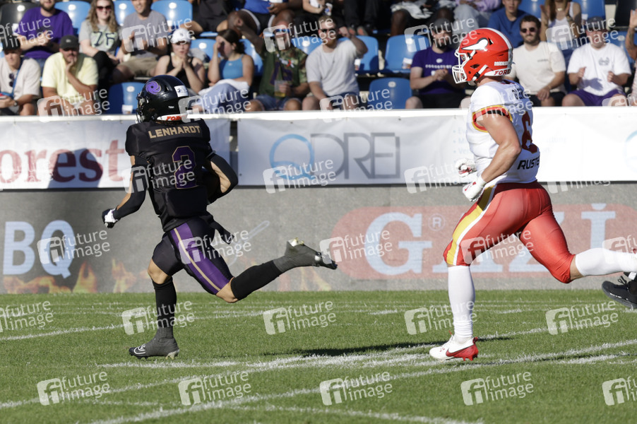 Paul Lenhardt (2) und Luke Glenna (6) beim American Football-Spiel Frankfurt Galaxy gegen Madrid Bravos in der PSD Bank Arena Frankfurt. Frankfurt am Main, 10.08.2024