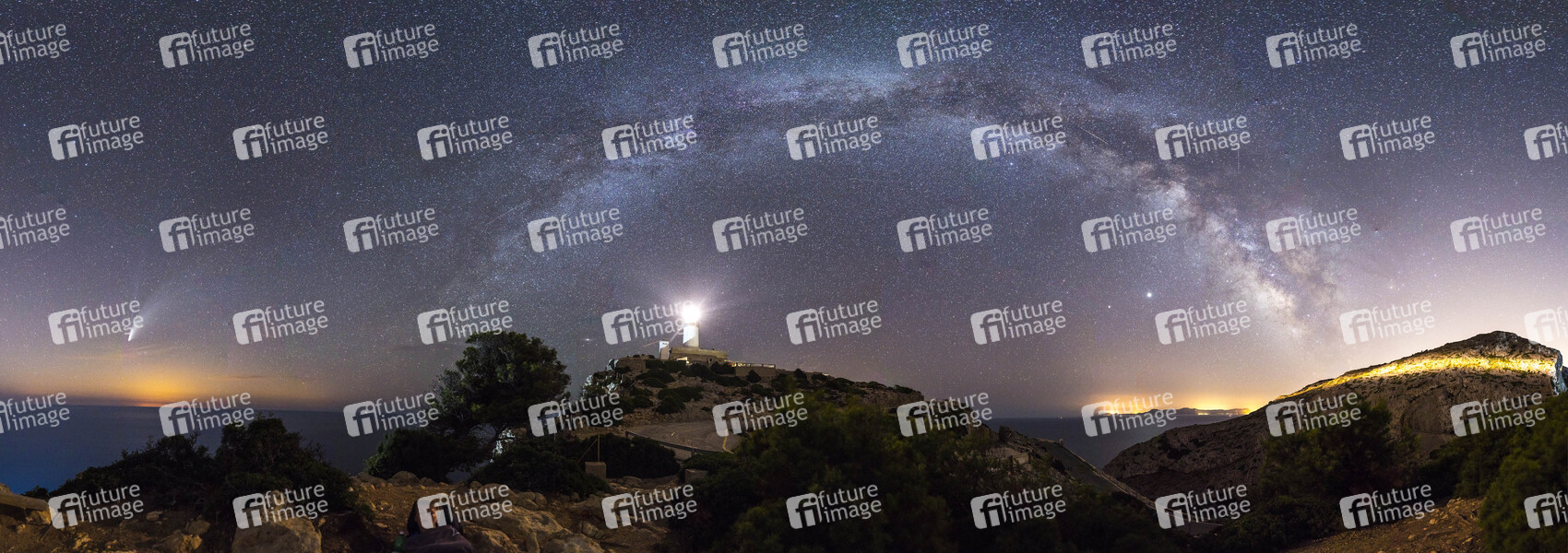 Die Milchstraße über dem Cap Formentor. Das Milchstraßensystem besteht aus etwa 100 bis 300 Milliarden Sternen und großen Mengen interstellarer und Dunkler Materie. Mallorca, 20.07.2020