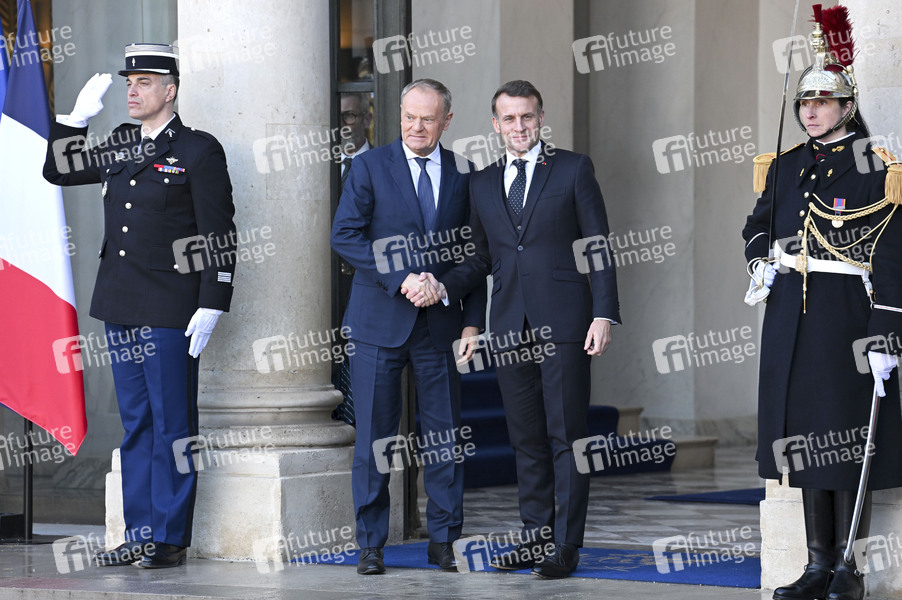 Donald Tusk und Emmanuel Macron beim Treffen der Koaltion der Willigen zu Beratung über die militärische Unterstützung für die Ukraine im Élysée-Palast. Paris, 06.01.2026