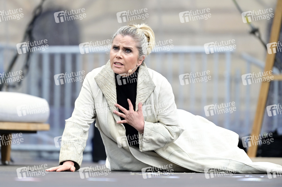 Michaela Schaffrath bei der Generalprobe des Theaterstücks 'Jedermann' bei den Thurn und Taxis Schlossfestspielen im Innenhof des Fürstlichen Schlosses. Regensburg, 26.07.2025