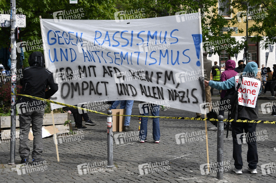 Auf dem Rosa-Luxemburg Platz haben sich 50 Demonstranten versammelt, um gegen Verschwörungstheoretiker zu demonstrieren. Die Polizei hat den Platz abgeriegelt und kontroliert jeden, der ihn betreten will. Am Samstag sind rund um den Rosa-Luxemburg-Platz mehrere 'Hygienedemos' und Gegenproteste geplant. Am Alexanderplatz sollen ab 14 Uhr insgesamt zehn Kundgebungen starten. Berlin, 16.05.2020