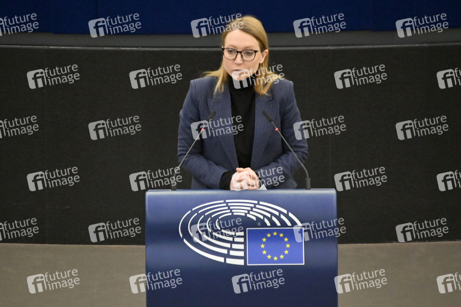 Aurore Lalucq bei einer Plenartagung zur Mindestbesteuerungsrichtlinie im Plenarsaal des Europäischen Parlaments. Straßburg, 04.04.2022