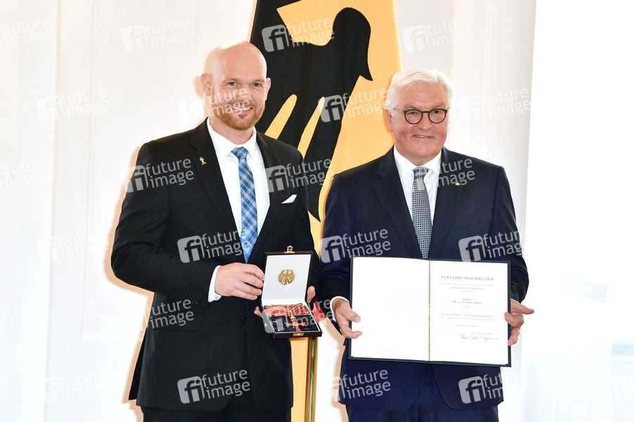 Alexander Gerst und Frank-Walter Steinmeier bei der Verleihung des Bundesverdienstkreuzes im Schloss Bellevue. Berlin, 02.10.2019