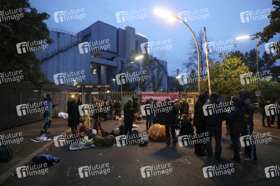 Aktivisten der Umweltschutzgruppe Extinction Rebellion demonstrieren vor dem Vattenfall-Kohlekraftwerk Reuter West. Etwa zehn von ihnen haben sich mit Sekundenkleber am Eingangsgitter festgeklebt. Nach Angaben der Organisatoren handelt es sich um eine schwedische Gruppe XR-Demonstranten. Berlin, 11.10.2019