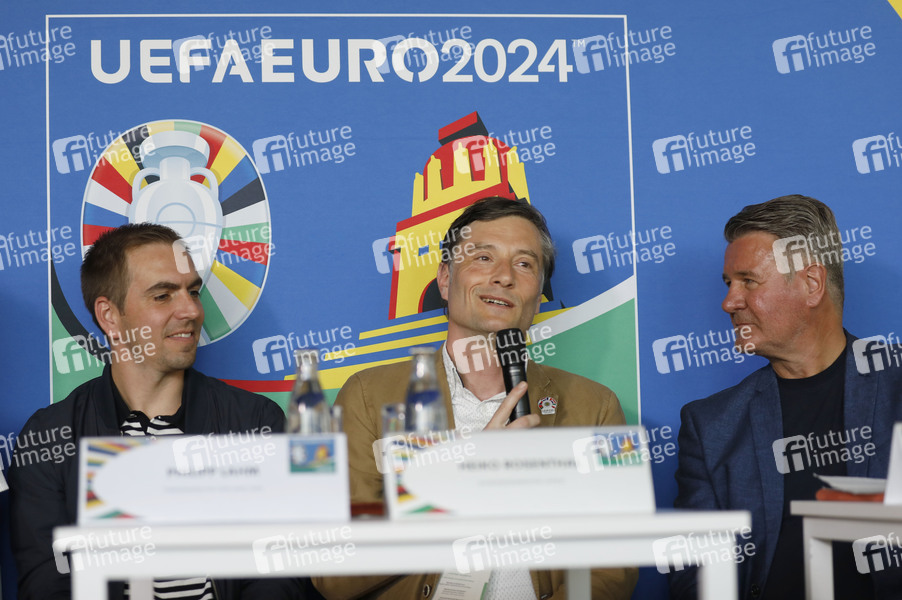 Philipp Lahm, Heiko Rosenthal und Michael Drevenstedt beim Mediengespräch zur Zwischenbilanz zu den Spielen der UEFA EURO 2024 in Leipzig im Media Centre. Leipzig, 24.06.2024
