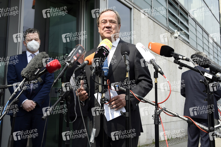 Armin Laschet bei einem Pressestatement zur Kanzlerkandidatur von Annalena Baerbock vor dem Konrad-Adenauer-Haus. Berlin, 19.04.2021