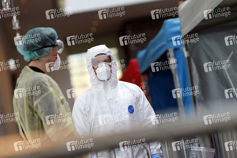 Die Stadt Köln hat ein drittes Infektionsschutzzentrum mit Mitarbeitern der Kölner Feuerwehr in Betrieb genommen, wo sich Bürger auf Covid-19 testen lassen können. Köln, 01.04.2020