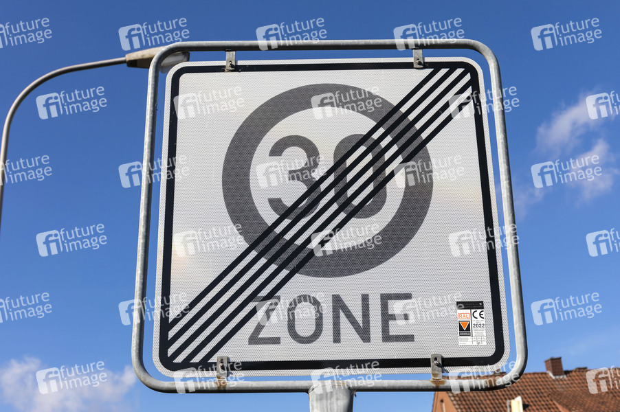 Verkehrszeichen 274.2, Ende einer Tempo-30-Zone. Eine Tempo-30-Zone ist ein Verkehrsbereich, der für eine Geschwindigkeitsbegrenzung von 30 km/h auf öffentlichen Straßen eingerichtet wird. Sie dient der Verkehrsberuhigung, besonders in Wohngebieten, und soll das Unfallrisiko senken sowie den Lärmpegel reduzieren. Tempo 30-Zonen werden von den Straßenverkehrsbehörden im Einvernehmen mit der Gemeinde eingerichtet. (Symbolfoto, Thememfoto) Stadthagen, 03.09.2025