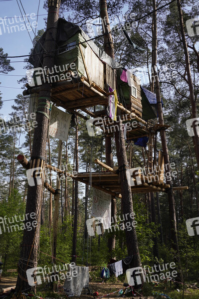Mit einem Camp im Wald bei Tesla in Grünheide protestieren Baumbesetzer seit Ende Februar gegen die Erweiterung der Gigafactory. Im Protestcamp leben derzeit etwa 20 bis 100 Menschen. Sie schlafen auf rund 15 Konstruktionen in den Bäumen verteilt oder in Zelten am Boden. Grünheide, 04.05.2024