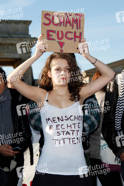 Flüchtlinge und Aktivisten, die vor dem Brandenburger Tor für eine neue Asylpolitik demonstrieren, werden von Politkerinnen der Piratenpartei unterstützt, Berlin