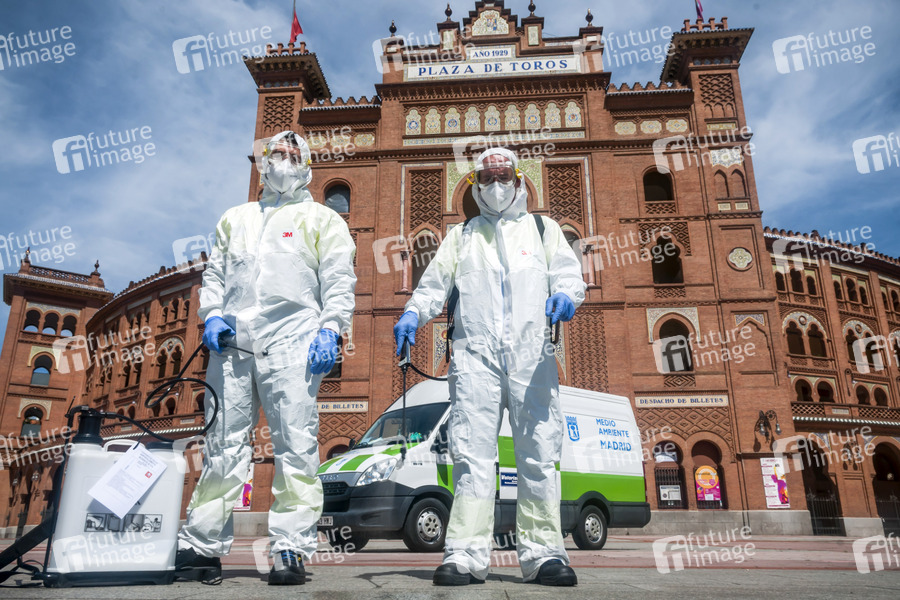 Desinfektionsmaßnahmen in der Umgebung der Stierkampfarena Las Ventas am 47. Tag seit Verhängung des Ausnahmezustands durch die spanische Regierung wegen der Coronakrise. Madrid, 30.04.2020