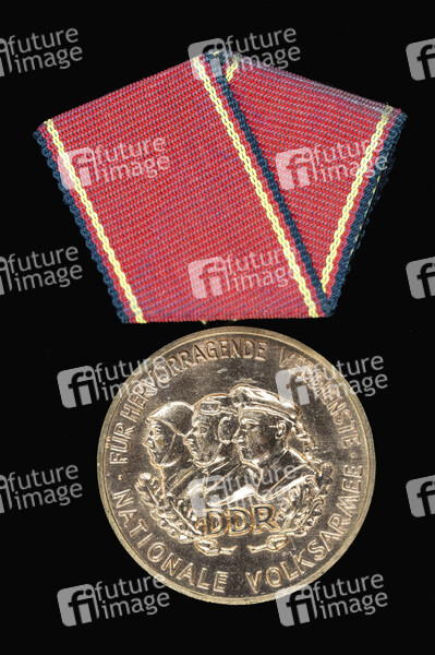 DDR Verdienstmedaille der Nationalen Volksarmee - Orden und Ehrenzeichen sind Auszeichnungen in Form tragbarer Abzeichen, die von staatlichen oder staatlich autorisierten Stellen als Belohnung für geleistete Dienste oder vorbildliches Verhalten verliehen werden, sowie um sich die Loyalität der auszuzeichnenden Person zu sichern. (Symbolfoto, Thememfoto)
