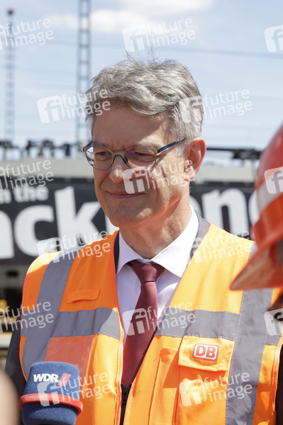Patrick Schnieder bei der Vorstellung der ersten Güterzuglokomotive, die für den automatisierten Streckenbetrieb umgerüstet wurde im DB Cargo-Werk Köln-Gremberg. Köln, 04.07.2025