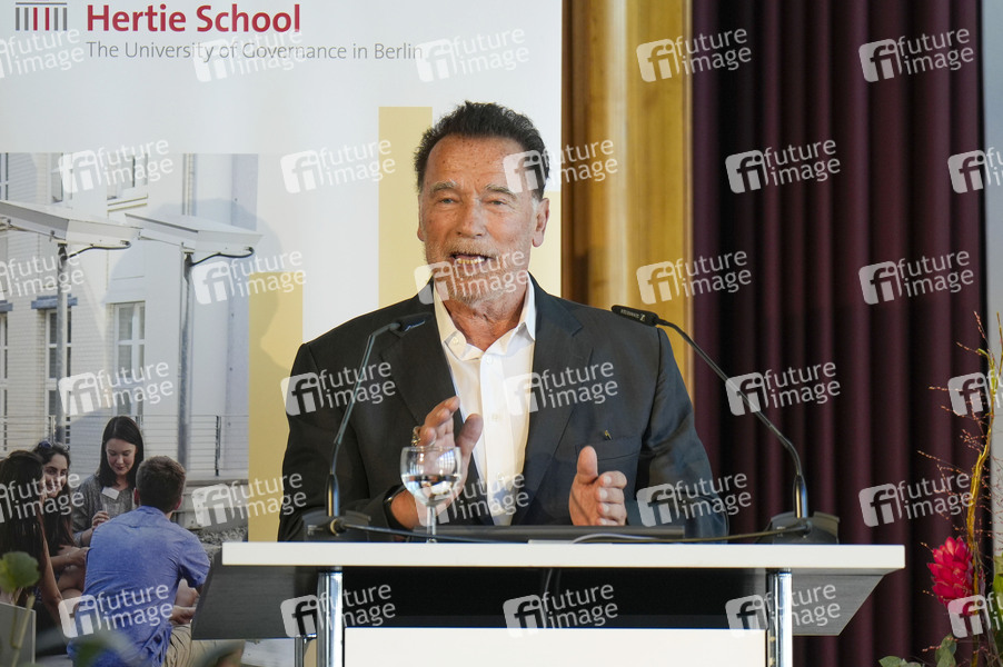 Arnold Schwarzenegger bei der Verleihung der Ehrendoktorwürde in Anerkennung seiner bedeutenden Beiträge im Bereich Governance, insbesondere durch seine Arbeit im Bereich Nachhaltigkeit und bürgerschaftliches Engagement in der Hertie School. Berlin, 17.09.2024