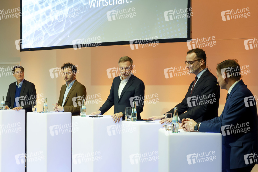 Karl Lauterbach, Felix Banszak, Christian Lindner, Jens Spahn und Kay Gottschalk beim Wahlforum Köln zur Bundestagswahl 2025 in der Alten Schalterhalle der IHK Köln. Köln, 19.02.2025