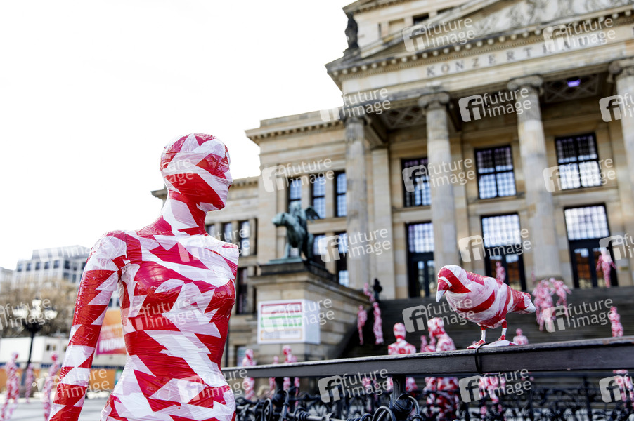 Installation 'It is like it is' des Künstlers Dennis Josef Meseg auf dem Gendarmenmarkt. Mit rotweißem Flatterband umwickelte Schaufensterpuppen sollen ein Mahnmal zur Coronakrise darstellen. Berlin, 03.04.2021