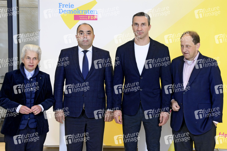 Marie-Agnes Strack-Zimmermann, Bogdan Balasynovych, Wladimir Klitschko und Alexander Graf Lambsdorff bei einem Fototermin vor Beginn der Sitzung des Arbeitskreises 'Freiheit und Menschenrechte weltweit' der FDP-Fraktion auf der Fraktionsebene im Bundestag. Berlin, 29.11.2022