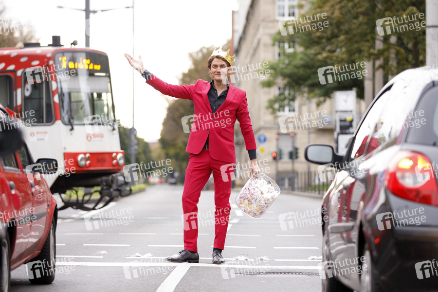 Matze Knop macht Passanten und Autofahrer an der Ampel am Ubierring auf sein neues Programm 'Matzeknopien' aufmerksam. Köln, 11.10.2019
