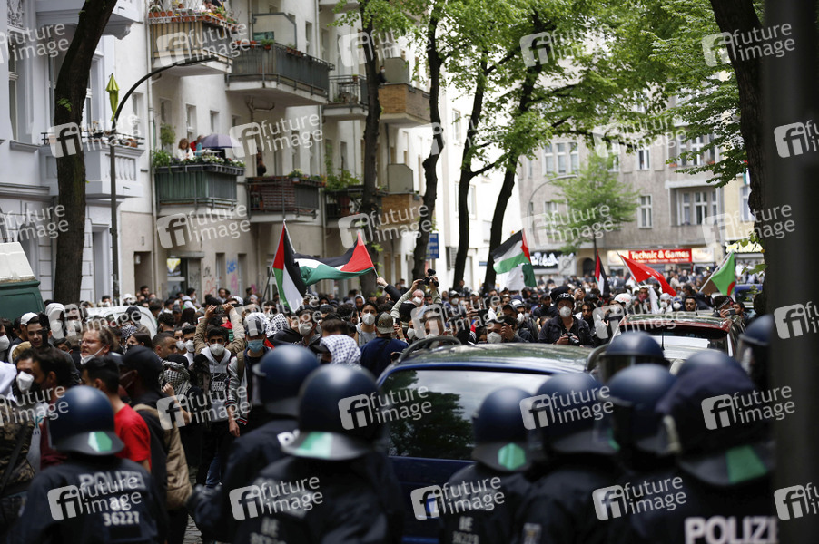 Laut Polizeiangaben demonstrierten Samstag 3500 Menschen in Neukölln bei einer pro-palästinensische Demonstration anlässlich der kriegerischen Auseinandersetzungen in Gaza. Als die Polizei wegen Verstößen gegen die Corona-Hygieneregeln die Demo auflöste, eskalierte die Situation und es kam zu massiven Ausschreitungen. Es gab Festnahmen. Berlin, 15.05.2021