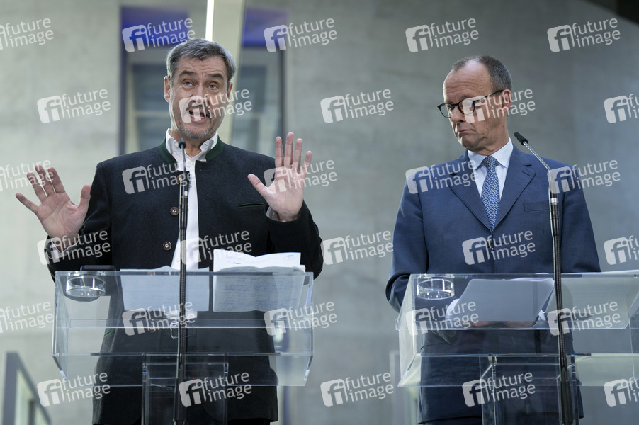 Markus Söder und Friedrich Merz bei einer Pressekonferenz nach den Sondierungsgesprächen der Partei- und Fraktionsspitzen von SPD, CDU und CSU im Reichstagsgebäude. Berlin, 08.03.2025