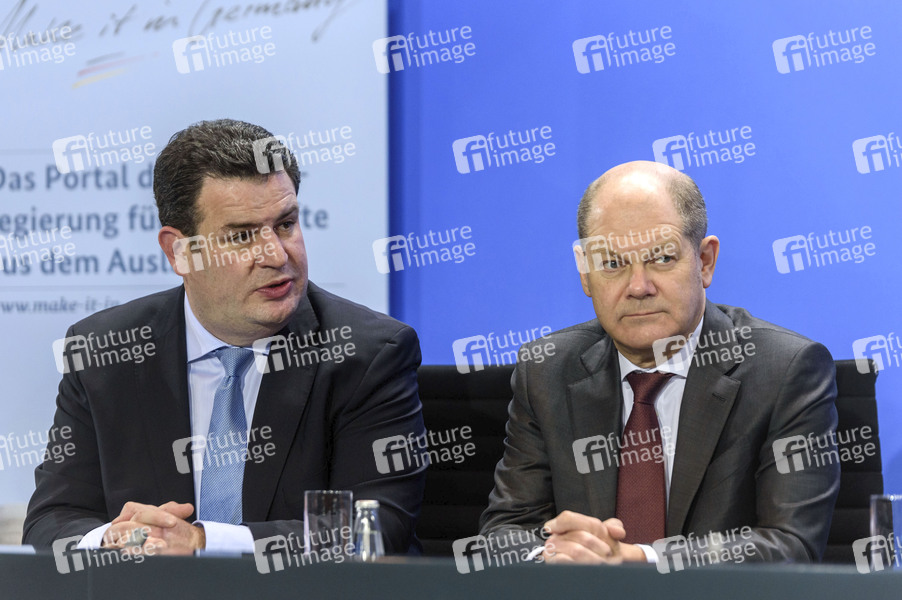Hubertus Heil und Olaf Scholz bei einer Pressekonferenz zur Unterzeichnung einer Absichtserklärung durch Vertreter der Bundesregierung und verschiedener Verbände und Institutionen zur Fachkräftezuwanderung im Berliner Bundeskanzleramt. Berln, 16.12.2019