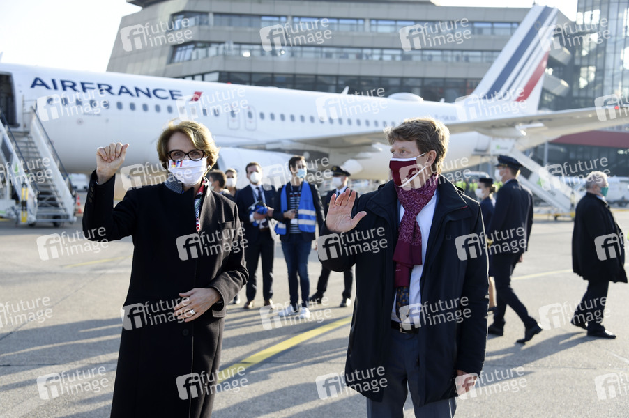 Botschafterin Anne-Marie Descotes und Flughafenchef Engelbert Lütke Daldrup beim letzten Abflug. Mit der Inbetriebnahme des Flughafens Berlin Brandenburg Willy Brandt (BER) wird der gesamte Luftverkehr der Hauptstadtregion an einem Standort konzentriert. Der Flughafen Tegel, kurz TXL, schließt am 8. November. 60 Jahre nach dem ersten Linienflug von Air France wird am 8. November ein Flugzeug der französischen Airline zum allerletzten Mal von dem Flughafen im Nordosten Berlins starten und Adieu sagen. Berlin, 08.11.2020