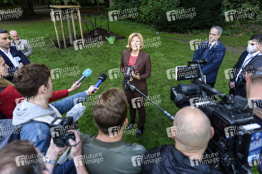 Bundeslandwirtschaftsministerin Julia Klöckner und Journalisten beim Pflanzen einer Erle im Berliner Tiergarten anlässlich des 300jährigen Bestehens der Baumschulen. Die Erle ist einer von 60 Zukunftsbäumen für die Städte im Klimawandel. Berlin, 10.09.2020