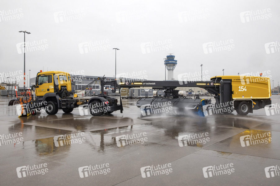 Winterdienst-Saison, Kehrblasgeräte, Schneeschild, Flächenenteisung, Landebahn, Startbahn, Lande- und Startbahn, Aviation, Flugzeuge, Winter, Eis, Schnee, Hightech-Fahrzeuge, Flotte, Sprühfahrzeug, Winterdienst-Container, Regen, Schlechtes Wetter, Minusgrade, Temperaturfall