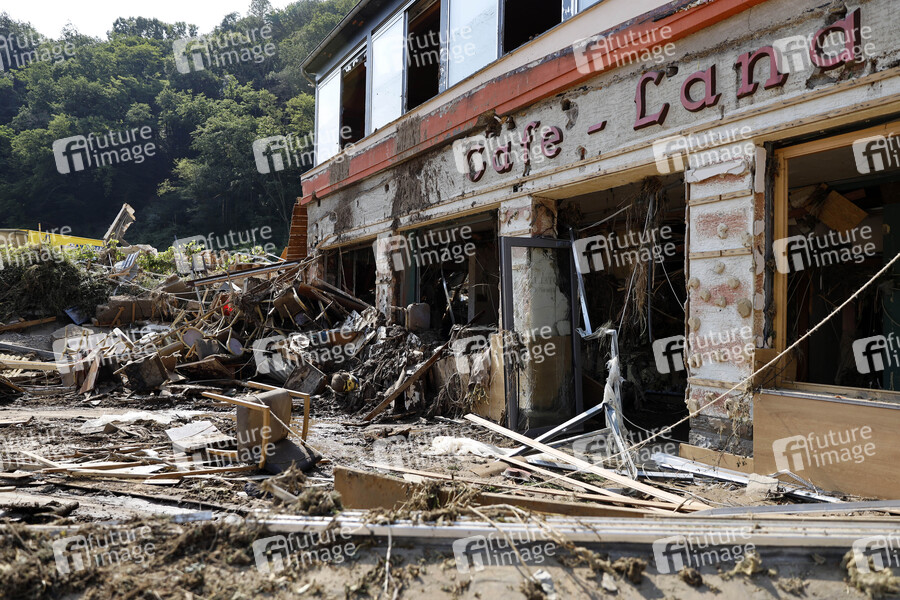 Nach dem Jahrhunderthochwasser in der Eifel durch heftige Regenfälle und Dauerregen mit Überschwemmungen und Überflutungen haben die Aufräumarbeiten im Ahrtal begonnen. Einheiten von Polizei, THW, Bundeswehr und Feuerwehr mitsamt vielen freiwilligen Helfern räumen Straßen, entfernen Schutt und Schlamm und versorgen die Menschen. Im Bild zerstörte Häuser in der Ortschaft Altenahr, in der die Flut viele Häuser zerstörte, 22.07.2021