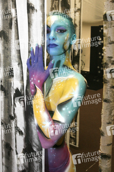 Bodypainting und Fotoshooting mit Model Sarah am Tag der offenen Tür der Meisterschule Justus-von-Liebig-Schule, Abteilung Floristik in Hannover-Ahlem. Künstler: Jörg Düsterwald