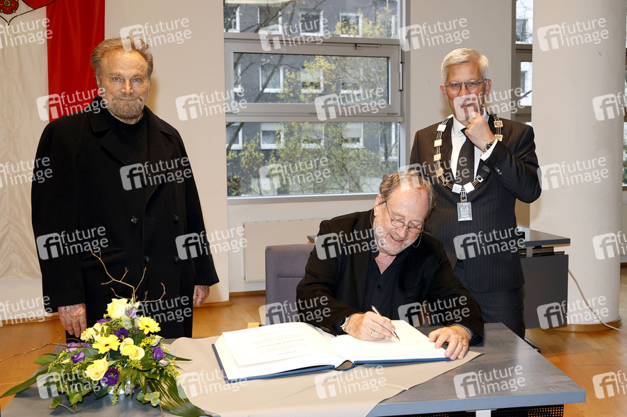 Franco Nero, Harold Faltermeyer und Erik O. Schulz beim Eintrag ins Goldene Buch der Stadt Hagen im Rathaus im Rahmen des 11. Eat My Shorts - Hagener Kurzfilmfestivals. Hagen, 16.11.2024