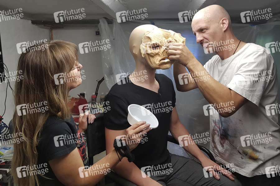 GEEK ART - Bodypainting and Transformaking: Enrico Lein mit Patrick Kiel und Assistentin Maria Skupin bei der Vorbereitung zum Captain America vs. Red Skull Photoshooting . Hameln, 20.09.2020 - Ein Projekt des Fotografen Tschiponnique Skupin und des Bodypainters und Transformakers Enrico Lein