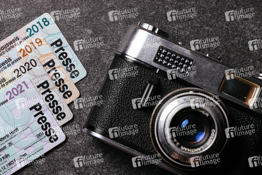 Presseausweise liegen auf einer Platte neben einer alten Fotokamera. (Themenbild, Symbolbild)
