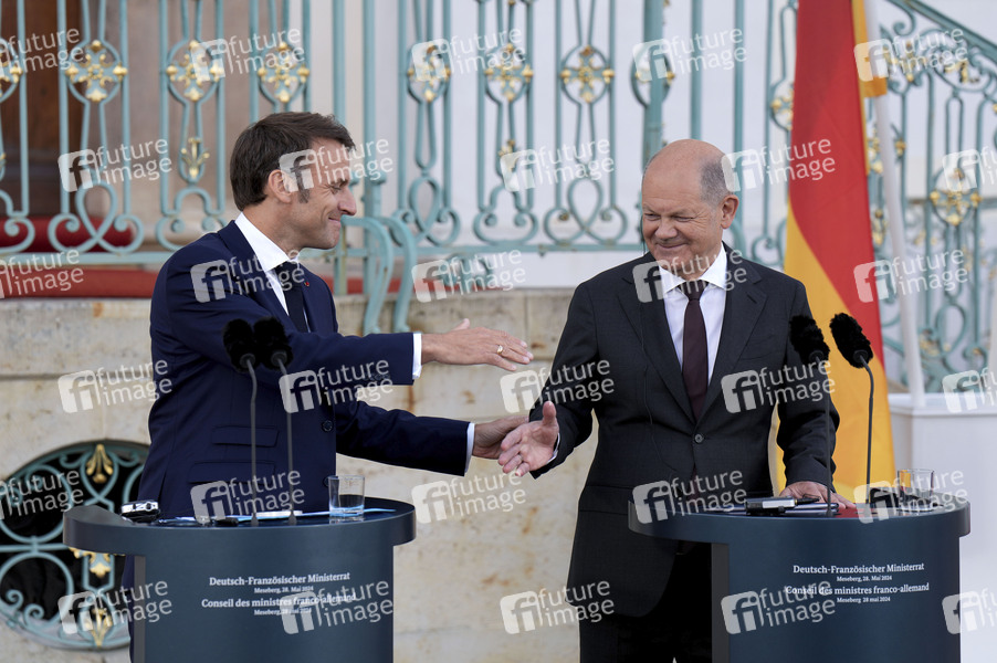 Emmanuel Macron und Olaf Scholz beim Treffen des Deutsch-Französischen Ministerrats im Gästehaus der Bundesregierung Schloss Meseberg. Meseberg, 28.05.2024