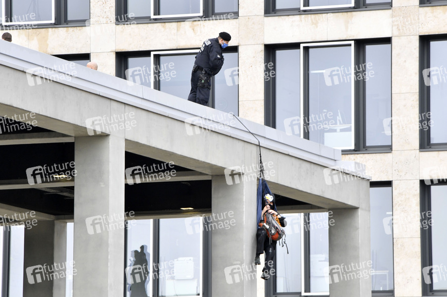 Klimaaktivisten der Aktionsgruppe 'Am Boden bleiben' protestieren gegen die Eröffnung des Flughafens Berlin-Brandenburg (BER). Schönefeld, 31.10.2020
