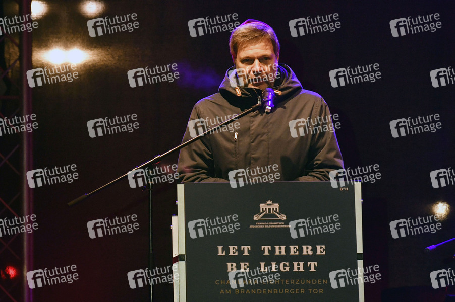 Robert Habeck beim Zünden der ersten Kerze am Chanukka-Leuchter anlässlich der beginnenden Chanukka-Feiertage am Brandenburger Tor. Berlin, 10.12.2020